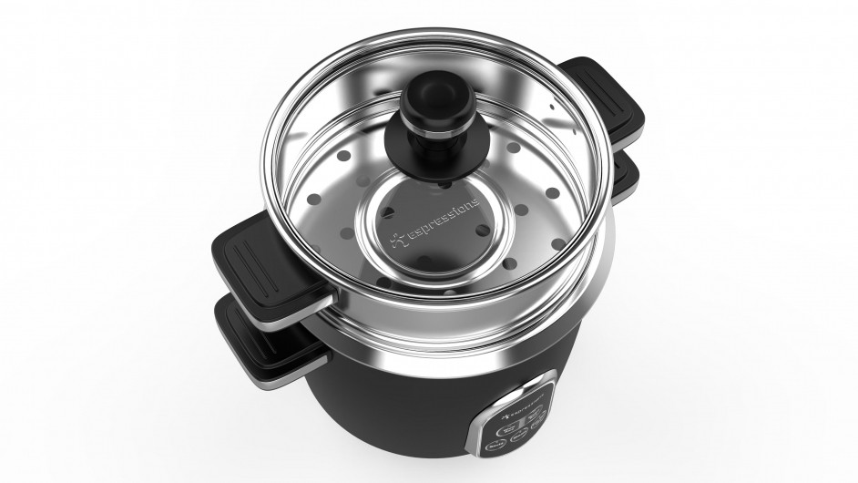 The Espressions Smart Rice Cooker is a multifunctional device. The rice cooker features a stainless steel inner pan with a capacity of 1.4 liters. The device comes with a steamer basket, glass lid, rice spoon and measuring cup.The rice cooker features two settings, for white and brown rice. In addition, the rice cooker includes a saute function, steam function and keep warm function. Cook rice perfectly and steam vegetables, fish and meat.
