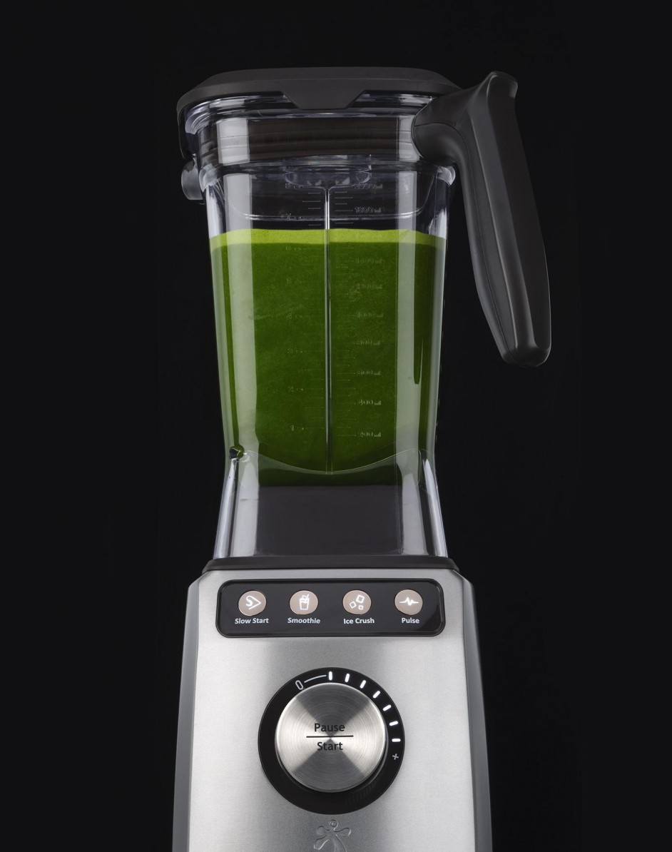 De blender is eenvoudig te bedienen met een overzichtelijke draaiknop en start/pauze-functie. Veiligheid staat voorop: de machine werkt alleen met deksel en bevat een stevige tamper om ingrediënten veilig naar de messen te duwen.